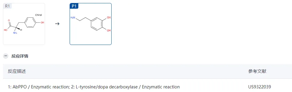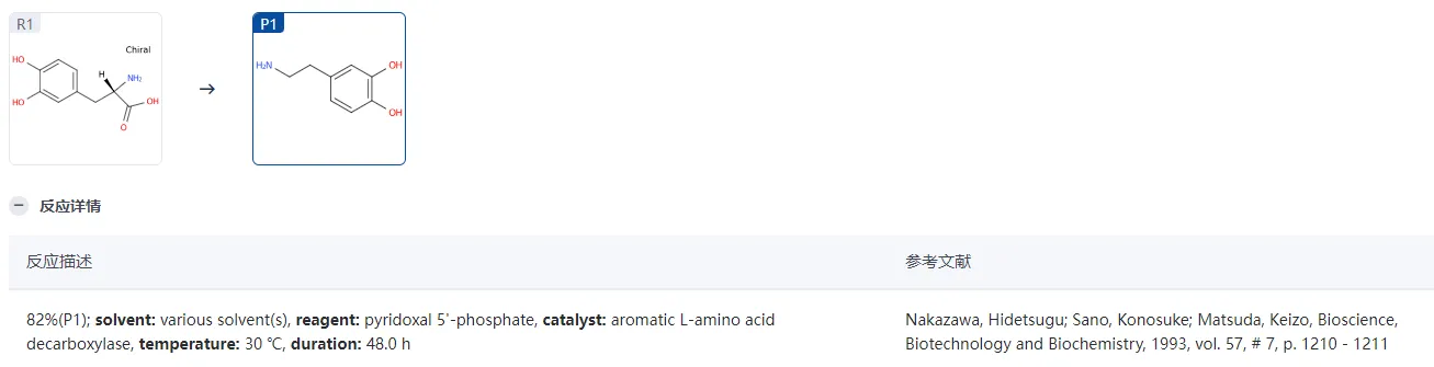 依据上述代谢数据可知,多巴胺的生物合成过程是复杂的,首先从酪氨酸开始。酪氨酸首先被酪氨酸羟化酶(tyrosine hydroxylase)催化,转化为多巴(DOPA)。这个过程需要氧和辅酶四氢生物蝶呤(tetrahydrobiopterin)。然后通过多巴脱羧酶(DOPA decarboxylase)的作用,将多巴脱去一个羧酸基团,转化为多巴胺。 在大脑中,多巴胺主要合成于几个重要的脑区,包括黑质(substantia nigra)和腹侧被盖区(ventral tegmental area)。这些区域的多巴胺能神经元通过它们的投射,调节运动、奖励和情绪等脑功能。
