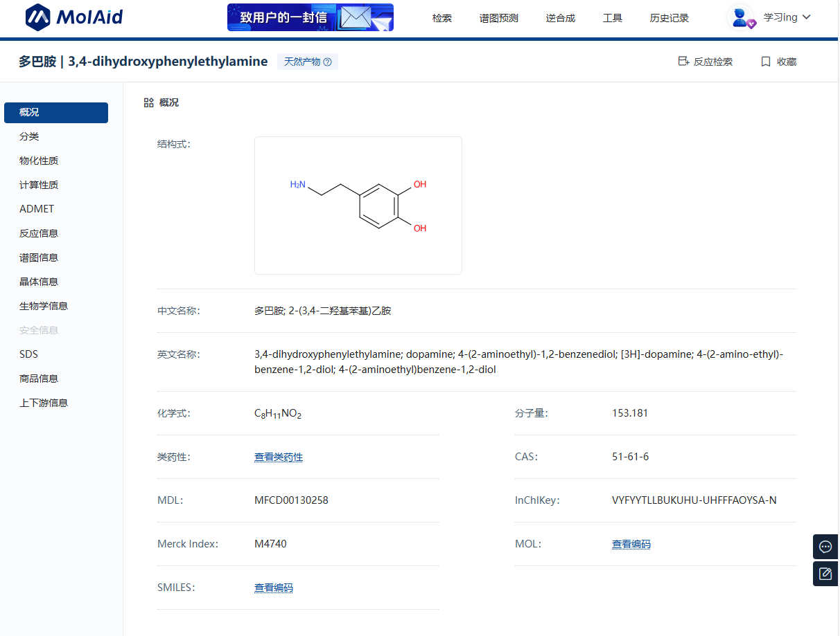 多巴胺(Dopamine)一种儿茶酚胺类化合物,又叫2-(3,4-二羟基苯基)乙胺。多巴胺的化学式为C8H11NO2,其分子结构包含一个苯环和两个相邻的羟基(-OH)。