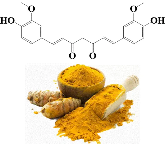 图2 姜黄素的化学结构式与姜黄素粉末图(图源于https://chem.molaid.com)