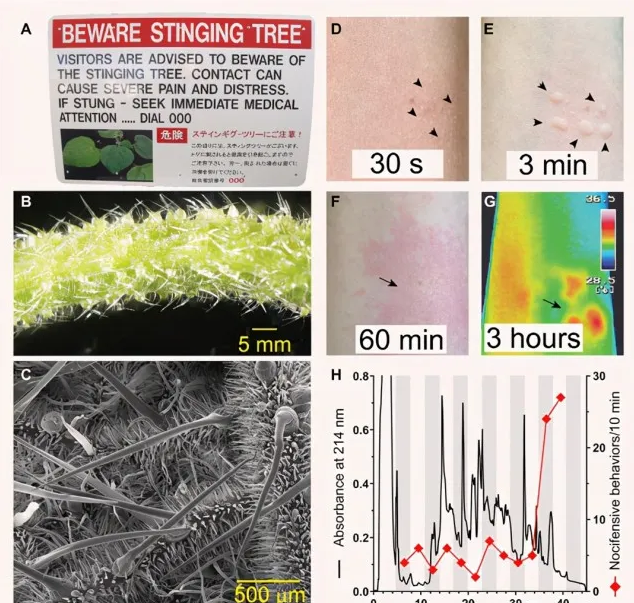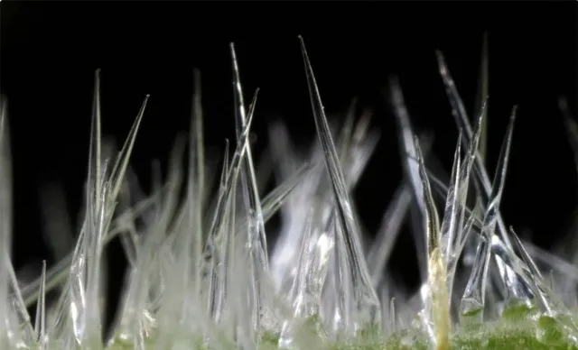 这种毛状体,主要是由二氧化硅构成的,可以轻易扎穿衣服,刺毛顶端有个求,在被触碰的时候,这个球就会脱落,下面的毛就会扎入人的皮肤,释放内部的毒液,因为人体无法分解二氧化硅,因此扎入皮肤的刺毛会时不时发作,在被按压或者刺激的时候,刺毛会再次释放出复叶。
