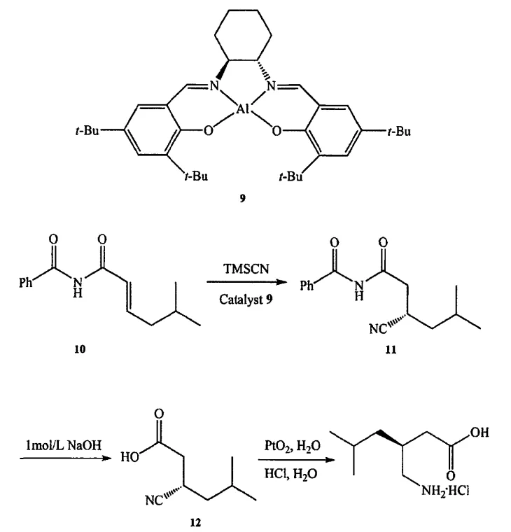 Sammis以 Salen-A1为催化剂、TMSCN 为氰源、醇类物质为反应溶剂,与 a,β-不饱和酸的衍生物发生不对称 Michael 加成反应,反应收率较高。在最佳条件下,以9为催化剂合成普瑞巴林的重要前体S构型的化合物,然后经水解、还原可得到盐酸普瑞巴林。