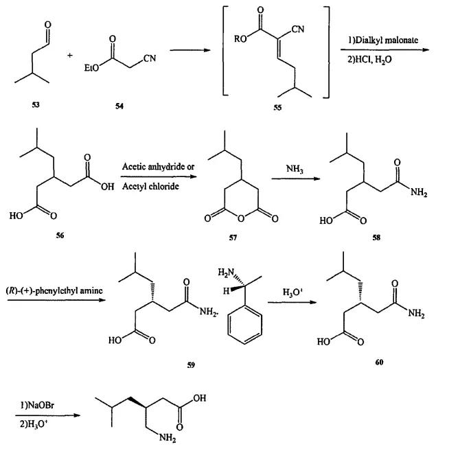 以异戊醛和氰乙酸乙酯为原料, 经 Knoevenagel缩合生成 (Z)-2-氰基-5-甲基-2-烯-己酸乙酯, 再与丙二酸二乙酯发生 Michael加成、水解脱羧生成3-异丁基戊二酸,用乙酸酐脱水环化生成3-异丁基戊二酸酐,后者在氨水中水解生成3-氨甲酰甲基一己一甲基己酸,Hofmann重排后得到消旋普瑞巴林,最后经S-扁桃酸拆分得到普瑞巴林,光学纯度为99.8%