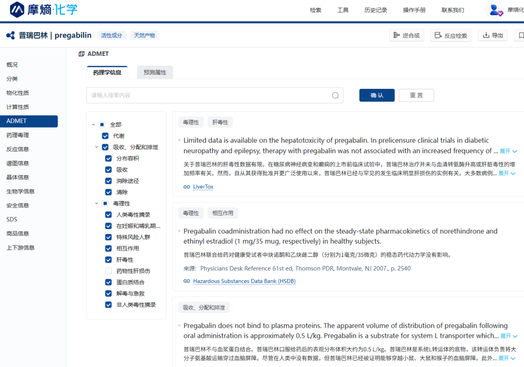普瑞巴林ADMET信息 图片来源:摩熵化学(MolAid)