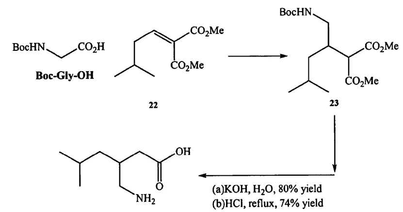 以 Boc 保护的甘氨酸作为无痕激活基团,3-甲基亚丁基丙二酸酯作为原料,在光介导催化剂 1mol%Ir[dF(CF3)ppy]2(dtbbpy)+、K2HPO4、DMF 和 26WCFL的作用下进行反应,以96%的收率得到对应的丙二酸酯。在碱性条件下水解,随后用酸回流促进脱羧得到普瑞巴林。