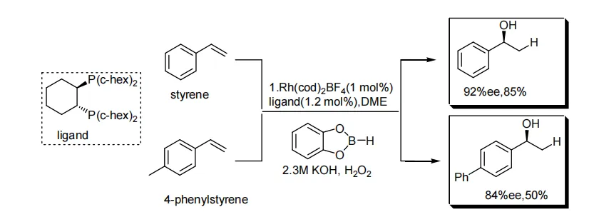 在铑催化不对称硼氢化苯乙烯衍生物反应中,PKnochel 和他的合作者曾用二膦烷作为配体。最好的结果是在用非常富电子的二膦烷及-35 ℃时获得的,得到的(s)-1 -苯基乙醇 ee 值高达 92%,区域选择大于 99:1( 马科尼科夫产物)。而降低反应温度会导致不反应,同时较高的温度也会导致较低的对映选择性和区域选择性 。该反应区域选择性在所有情况都是很好的,但取代基电负性,位置和大小都对其对映选择性有深刻影响。