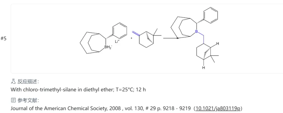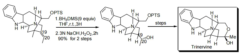 在对映选择性全合成吲哚生物碱 trinervine 时,J.M.Cook 和他的合作者通过碳9到碳20之间的挂式双键的硼氢化反应和氧化反应而获得使了很好的对映选择性。