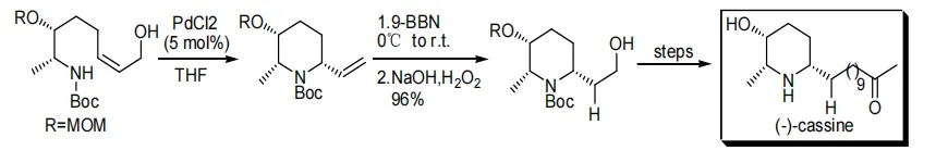 H.Makabe 在实验室完成了不对称全合成(-)-山扁豆碱的合成。合成路线中有一步,即用氯化钯高度非对映选择催化非环化反应生成氨基烯丙胺醇,这是一个关键的步骤。接下来环状物用 9-BBN 硼氢化,继而接着氧化成想要的主要产物醇类,醇类接着便可以转化为(-)山扁豆碱。