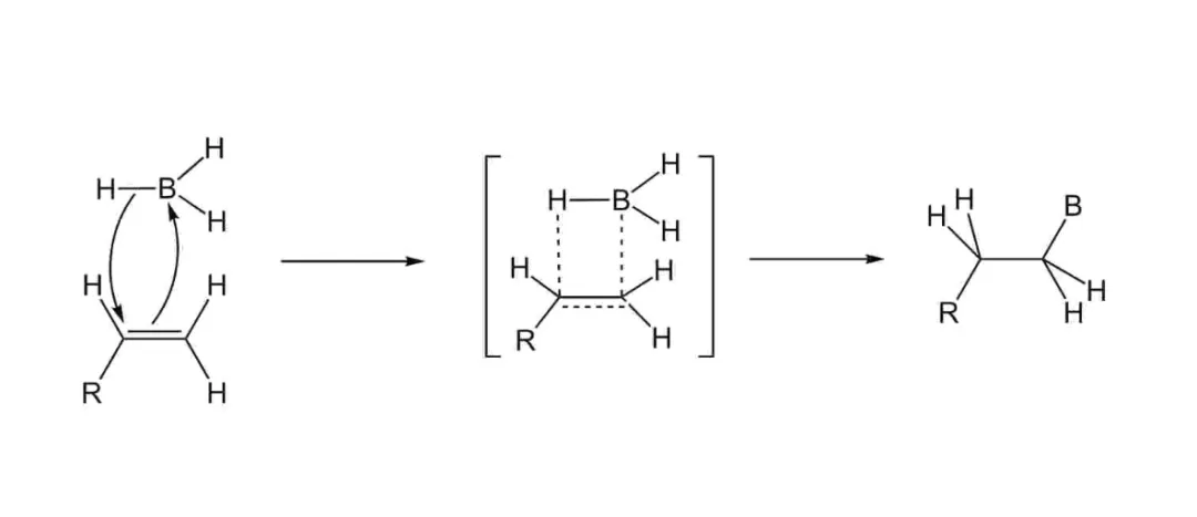 硼烷加到双键上是一个协同进程,经过一个四元环中心过渡态。