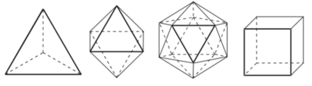 柏拉图在讨论世界本源问题时,曾提到过这样一类具有丰富的形式美的事物——柏拉图多面体。他认为,物质的基本组成成分由于太小而无法被感知,但它们呈现多面体型(火/正四面体、气/正八面体、水/正二十面体、土/立方体),这可以看作分子理论的雏形。