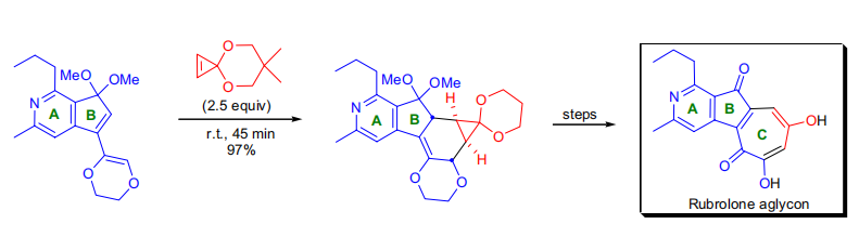 D.L.Boger实验室完成了Rubroloneaglycon全合成,这是正在进行的探索环丙烯酮缩酮环加成反应的研究的一部分。七元碳环产生的关键步骤是富电子二烯与张力很大的亲二烯体的分子间Diels-Alder反应。 环加成以极好的收率(97%)和完全的非对映选择性进行。