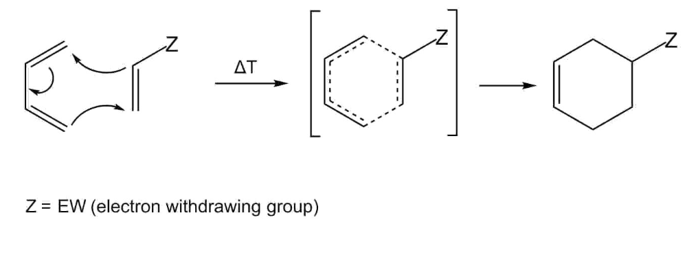 在协同反应中,没有活性中间体如碳正离子、碳负离子、自由基等产生。双烯体具有共轭双键,可以是开链的或环状的,可以连有各种取代基。但它必须具有s-顺构象或者可以由s-反构象转变为s-顺构象(如下图),其中s指的是两个π键中间的单键。亲双烯体只有一个π键参与反应。