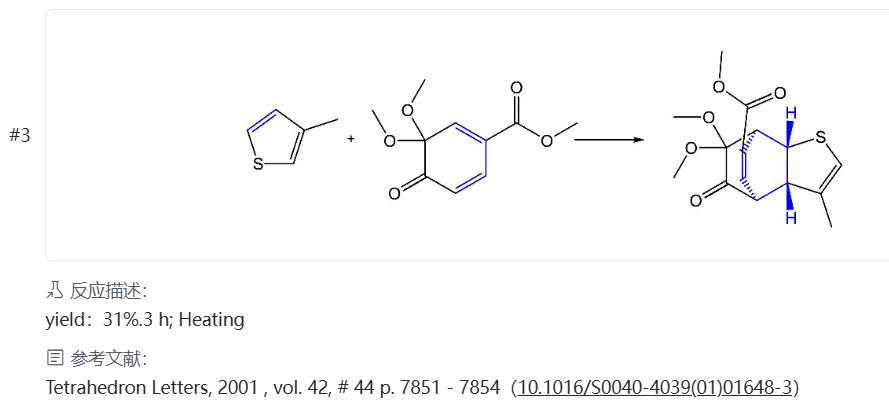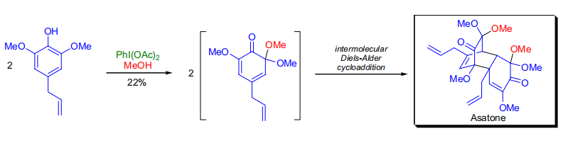分子内Diels-Alder环加成是一种非常强大的合成工具,因为它可以在一个步骤中产生分子复杂性。S.Antus及其同事通过使用高价碘试剂(例如,PIDA)使邻甲氧基苯酚去芳构化得到了环己-2,4-二烯酮反应物。 这些二烯酮迅速二聚,得到重度取代的复杂三环化合物。 2,6-二甲氧基-4-烯丙基苯酚与PIDA /甲醇的去芳构化使得在一个步骤中形成了天然产物细辛酮。