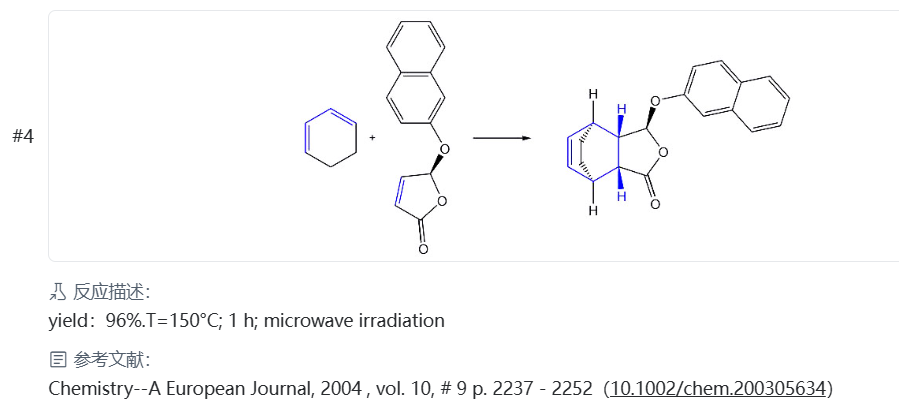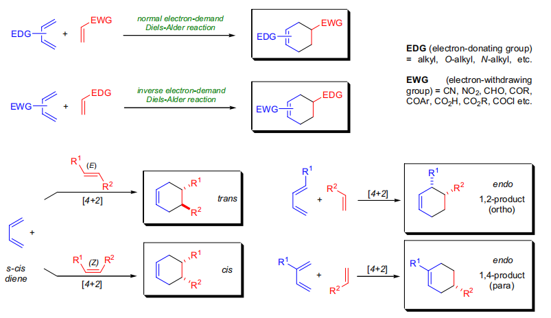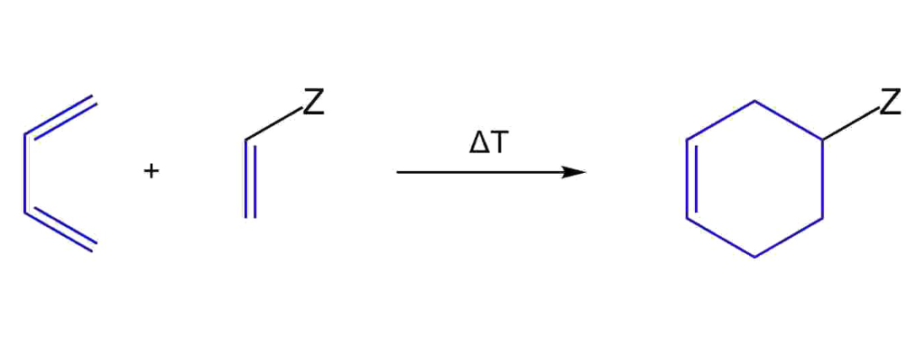 Diels-Alder反应的反应物分成两部分,一部分提供共轭双烯,称为双烯体,另一部分提供不饱和键,称为亲双烯体。改变共轭双烯和亲双烯体的结构,可以得到多种类型的化合物,并且许多反应在室温或在溶剂中加热即可进行,产率也比较高,是合成六元环化物的重要方法。