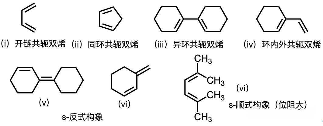 协同反应的机理要求双烯体的两个双键必须取s-顺式构象,如下面的(i)~(v)。s-反式的双烯体不能发生该类反应,如(v)、(vi)。