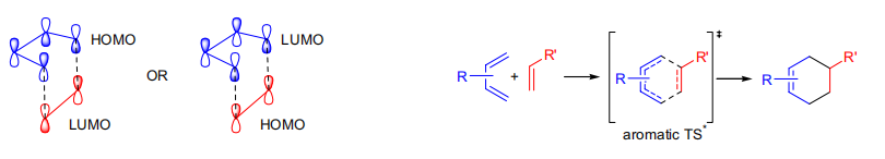 Diels-Alder反应是一步完成的,新的σ键和π键的生成和旧的π键的断裂是同步进行的。反应时,反应物分子彼此靠近互相作用,形成一个环状过渡态,然后逐渐转化为产物分子。也即旧键的断裂和新键的形成是相互协调地在同一步骤中完成的。具有这种特点的反应称为协同反应。