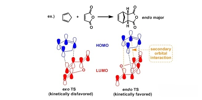 反应按协同反应顺式加成来进行的,优先生成endo加成产物(endo规则)。通常电子要求型的情况下二次轨道相互作用大致能解释这一规则,但endo/exo选择性也受立体影响,根据不同底物,完全选择生成exo产物的例子也有报道。除此之外分子内的Diels-Alder反应由于环状结构固定,构型自由度较低,也不完全适用endo规则。