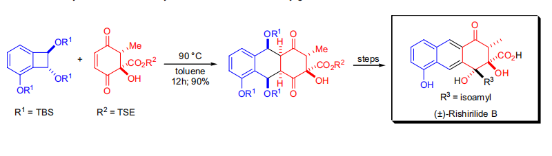某些官能团可以通过氢键指向分子间Diels-Alder环加成的结果。S.J. Danishefsky实验室在(±)-rishirilide B的全合成期间,关键的Diels-Alder环加成步骤就是这种情况。二烯是原位热生成的。