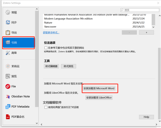 一般情况下,安装Zotero软件之后会默认安装Word插件,其会在 Microsoft Word里添加一个Zotero选项卡。如果没有的话,在Zotero的“编辑-设置”中点击“引用”,点击“重新安装加载项”即可。