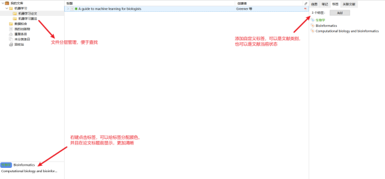 Zotero支持创建多个分类(类似于文件夹),实现文献的分层管理。并且还提供标签功能,右键该标签就可以指派颜色和位置,可以根据自己的习惯对文章添加标签,使得文献分类及状态更加醒目,从而对文献进行分类管理。