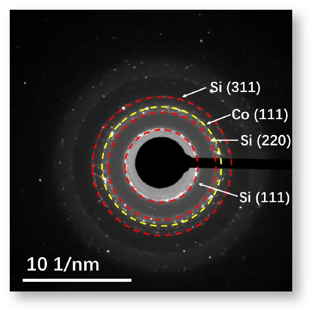 对于多晶材料,将所得结果导入如PPT或Photoshop等作图软件,并进行相应的处理,就可以得到衍射圆环的SAED图谱。如下图所示,通过这种方式,可以清晰地展示多晶材料的衍射特征。