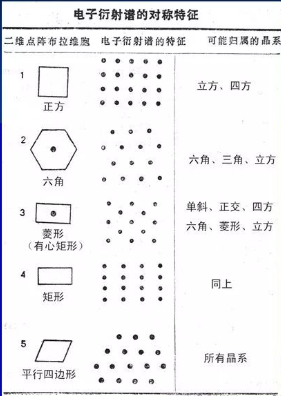 TEM电子衍射花样的标定实际上就是通过电子衍射花样测量样品中晶面的间距和晶面法向的夹角,对照标准图谱来确定样品的晶体结构。不同结构晶体的电子衍射谱具有不同的对称特征。利用电子衍射谱的对称性,往往可迅速判断其所属晶系。