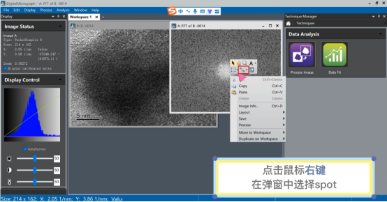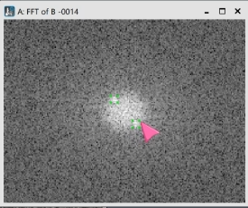 3.将FFT弹窗调整至合适的大小,找到最亮的两个光斑,点击鼠标右键在弹窗中选择“spot”,移动到与最亮的两个光斑重合。