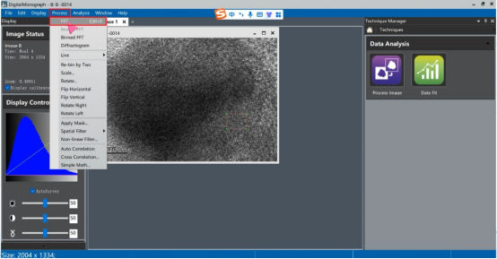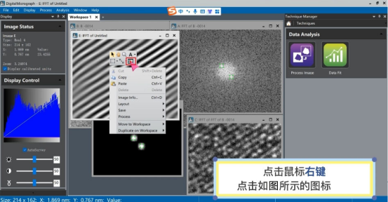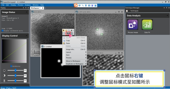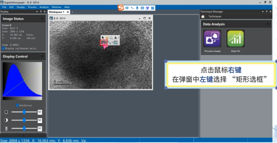 1.打开一张“.dm3或者.dm4”格式的高倍率TEM照片, 在照片界面点击鼠标右键,在弹窗中左键选择 “矩形选框”。