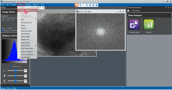 2.在图像中框选合适范围,框选完成后点击菜单“Process”再点击“FFT”。