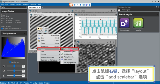 14.点击鼠标右键,选择“layout”点击“add scale bar”选项,在前面得到的晶格条纹图上会出现标尺。