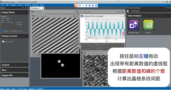 13.在新增图像上按住鼠标左键拖动出现带有距离数值的虚线框根据距离数值和峰的个数计算出晶格条纹间距。