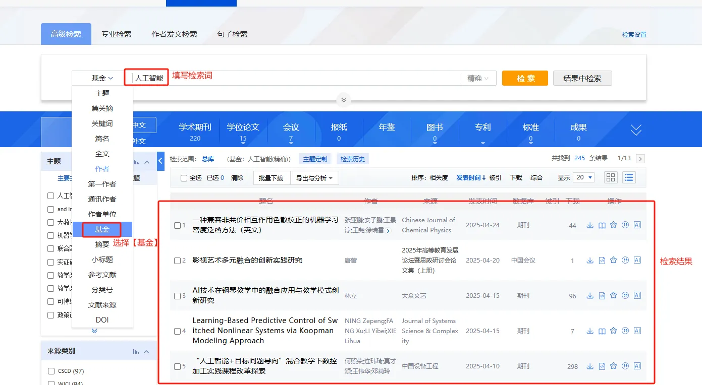 3.4 知网or万方:通过检索文献间接性的查看基金内容,无法直接对基金项目进行检索。