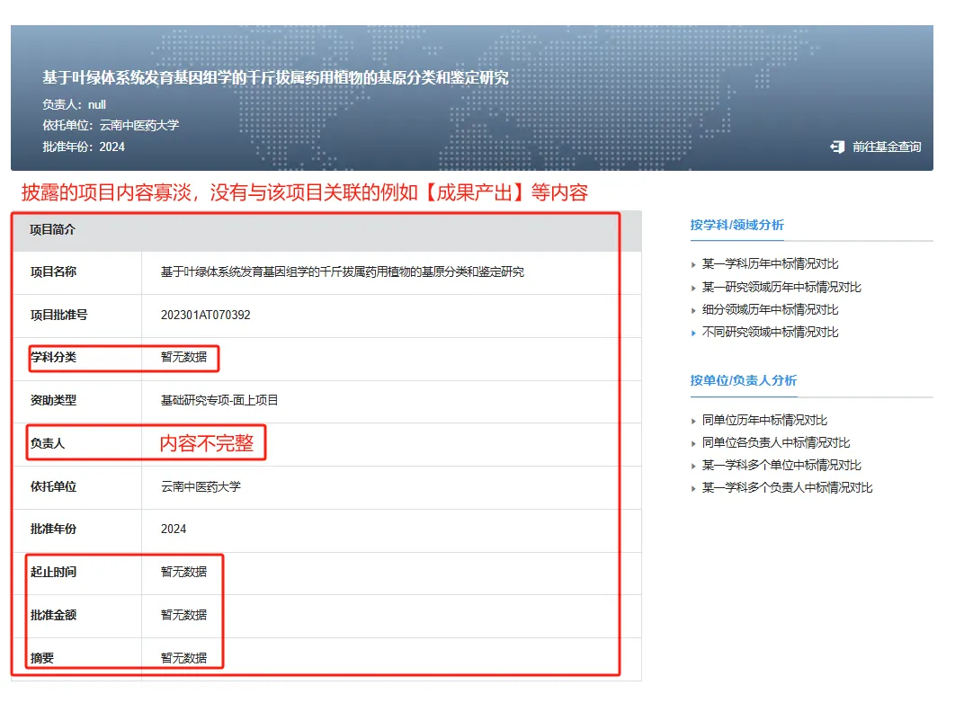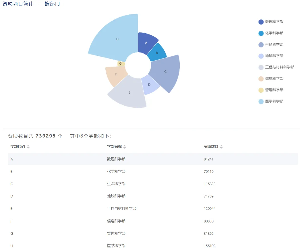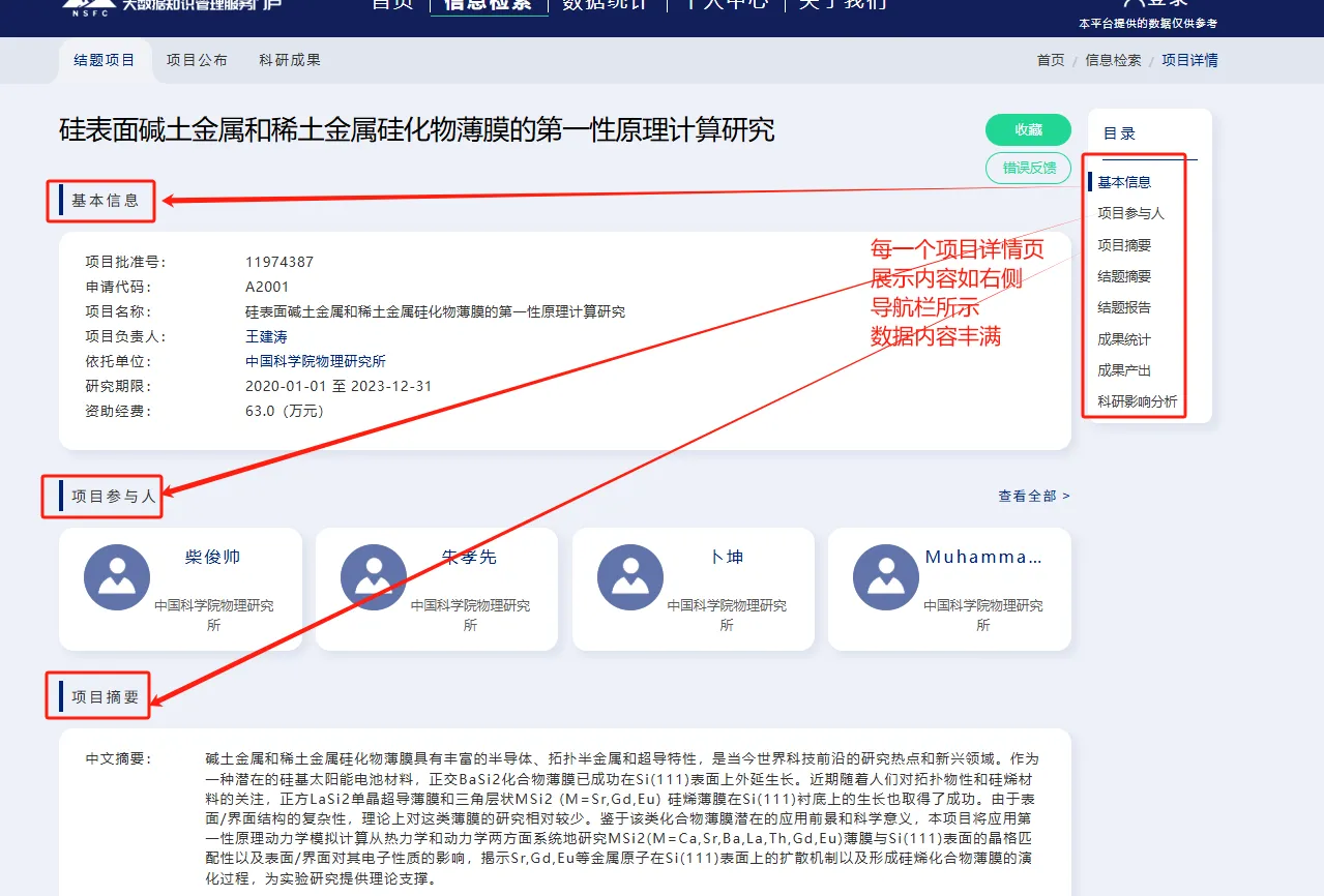 3.5 国家自然科学基金委员会:国家官方基金项目查询网站,数据量大、数据详情展示内容丰富,可按照学部、分类、日期、机构、年度进行检索。