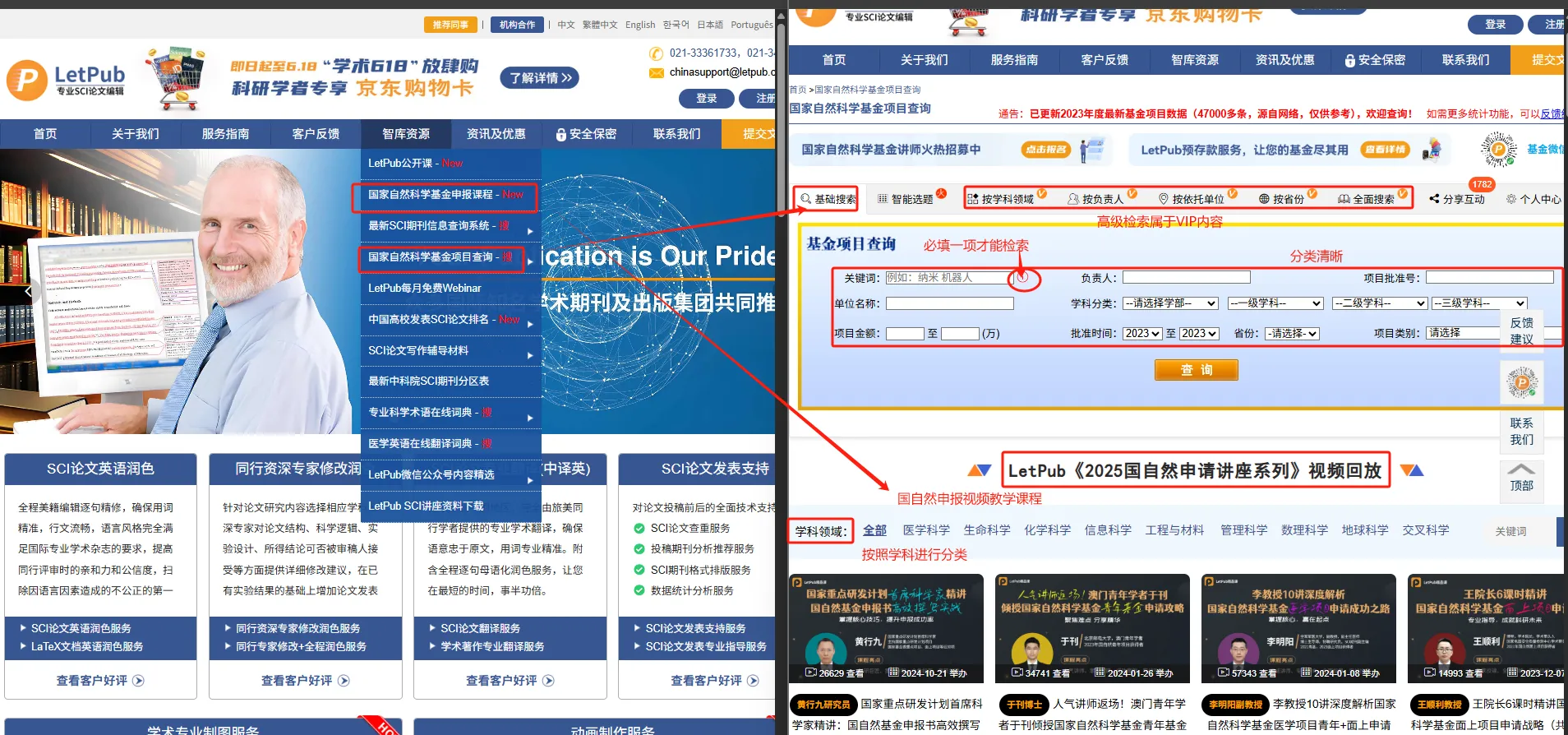 3.2 LetPub:数据分类规整,数据形式饱满,且有国自然申请视频指导,可以给第一次申请国自然的科学家提供一定的指导建议。
