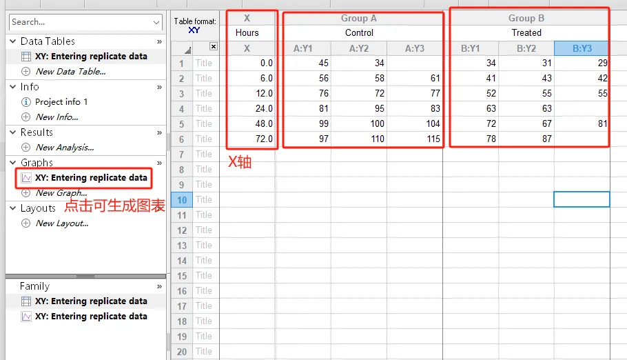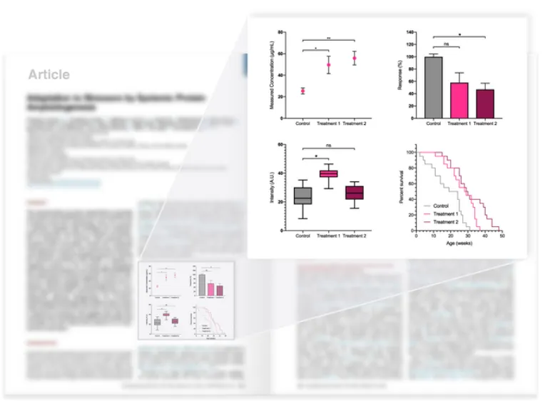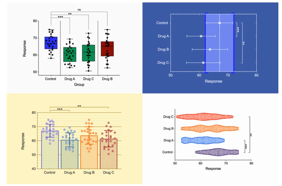 GraphPad Prism专注于数据呈现而非软件操作,让图形创建变得轻松。选择所需的图形类型后,您可以自由调整各项细节:数据排列、数据点样式、标签、字体、颜色等。自定义选项丰富多样,满足各种需求。