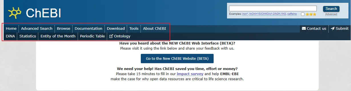 打开浏览器,输入 ChEBI 数据库的官方网址:https://www.ebi.ac.uk/chebi/ ,即可进入数据库首页。首页界面简洁明了,主要功能区域清晰分布。