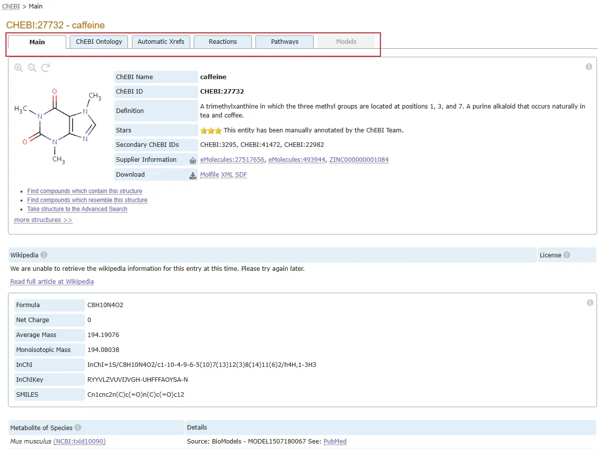 页面右侧会呈现该化学实体的诸多详细信息,包括本体定义、星级状态(“三星” 表示完全注释条目,数据可靠性更高;还有部分是在其他地方整理但尚未经 ChEBI 策展人检查的数据)、二级标识符(即与该记录合并的其他记录的标识符,搜索任意二级 ID 可自动定位并显示合并后的记录)以及丰富的交叉引用信息,链接到其他相关数据库,如 PubChem、KEGG 等,便于获取更全面的数据。同时,若有相关 Wikipedia 文章,也会在此列出链接。