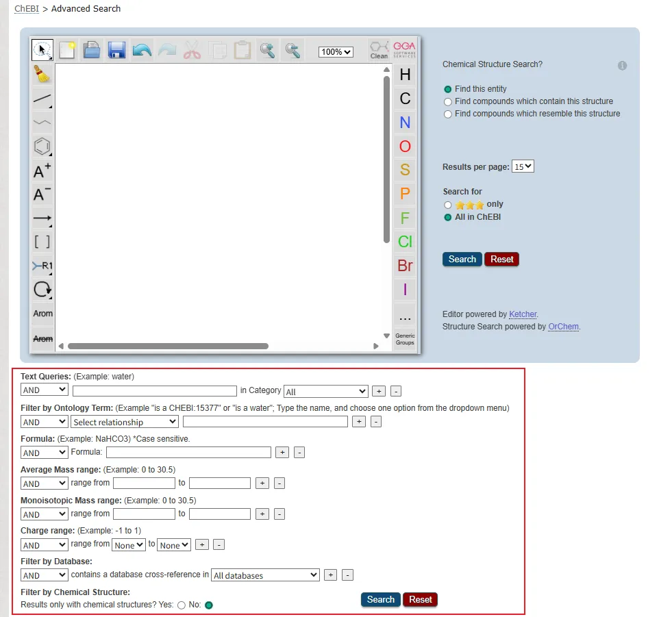 高级搜索:点击搜索框旁边的 “Advanced Search” 链接,进入高级搜索页面。这里可进行更复杂、精准的筛选,能结合文本、化学结构以及本体关系等多方面条件进行联合搜索。例如,若要查找具有特定结构片段且参与某类生物过程的化学实体,就可在此通过绘制结构以及设置本体相关条件来实现。