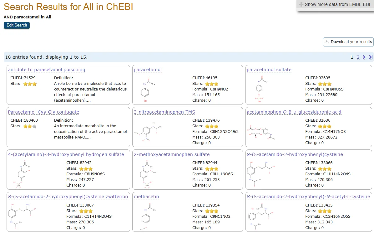 输入查询内容或设置好高级搜索条件后,点击 “Search” 按钮,数据库将开始检索并呈现结果页面。结果页面会展示与查询匹配的 ChEBI 条目列表,每个条目包含基本信息预览,如推荐的 ChEBI 名称、ChEBI ID 等。搜索结果支持下载,可选择以 TSV(制表符分隔值)、XML(可扩展标记语言)或 SDF(结构数据文件)等格式下载,方便导入到其他分析软件或应用程序中作进一步处理。