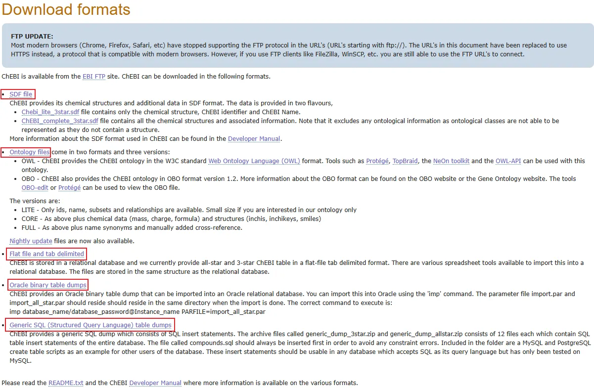 对于数据批量需求,可通过访问https://www.ebi.ac.uk/chebi/downloadsForward.do进行需求数据下载。数据格式包括SDF(结构数据)、OWL(本体文件)等等,可根据下游分析工具选择适配格式 。