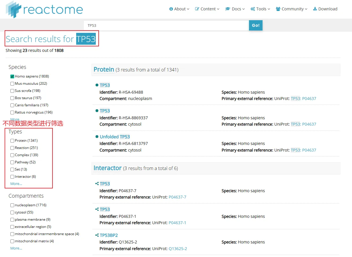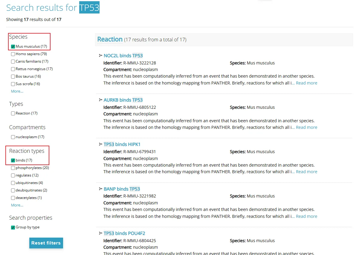 筛选功能:若需精准筛选,可在搜索结果页面使用筛选功能,按物种、数据类型(通路、分子)、证据等级等条件缩小范围。例如,筛选出小鼠中与免疫相关的通路,可先选择物种为 “Mus musculus”,再结合反应类型如“binds” 进行二次筛选,得到精准筛选结果。