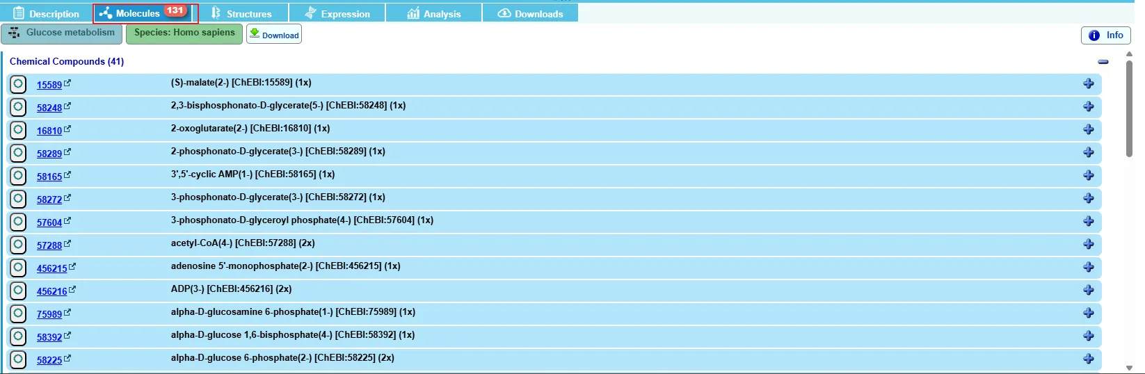 下方通路详情栏可查看该通路中包含的所有化合物、蛋白等分子信息,选中其中的分子还可查看该分子的具体结构、表达信息等。