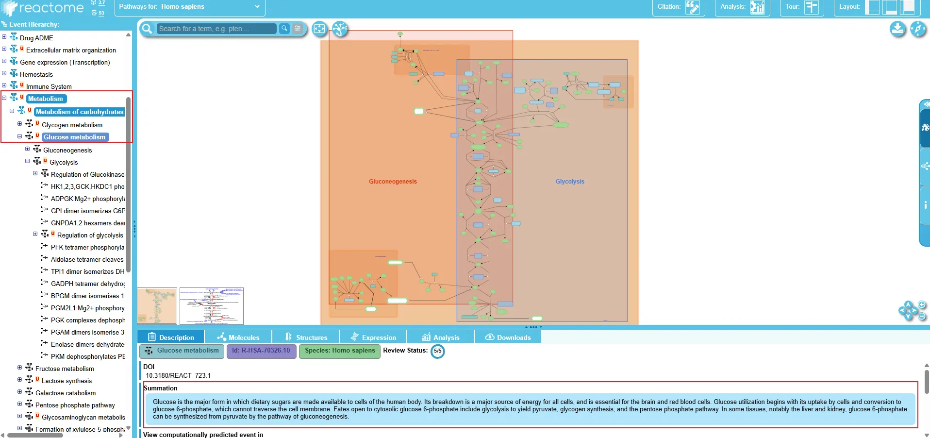 例如,点击 “Metabolism”,可进一步查看 “Metabolism of carbohydrates and carbohydrate derivatives”、“Glucose metabolism”(等子类别,点击具体子通路名称,即可进入该通路的详情页面,查看通路中的分子组成、反应步骤及相关文献依据。