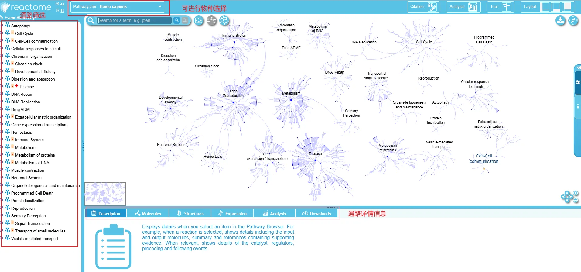 通过上述步骤,用户可高效利用 Reactome 数据库查询通路信息、获取基因、分子功能表达数据等。在实际研究中,结合数据库的注释信息与实验数据,能更深入地解析生物学机制,为科研提供有力支持。下一篇内容将详细讲解Reactome通路分析工具“Analysis Tools”的使用方法。