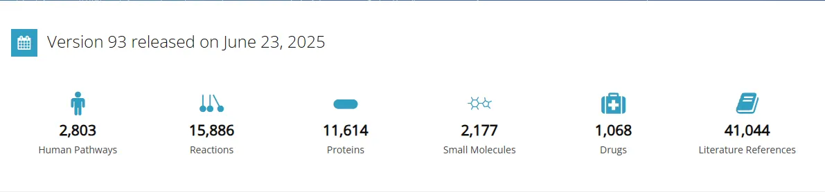 截止2025年6月23日最新版本version93,Reactome数据库包含人类通路数据2803条,涉及反应15886条,参考文献41044篇。