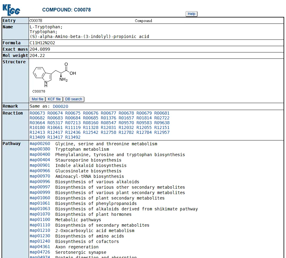 COMPOUND:收录小分子化合物信息,输入 C 编号(如 C00078)或分子式(C11H12N2O2)可查询结构、分子量及参与的代谢反应。