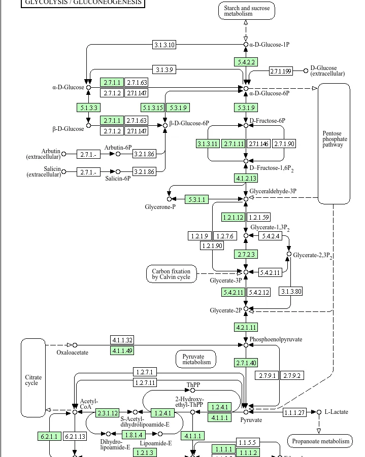 3. 挖掘关键基因:在 hsa00010 通路图中,点击绿色方框(如 K00844 己糖激酶),查看其在人类中的基因成员(如 HK1、HK2)。