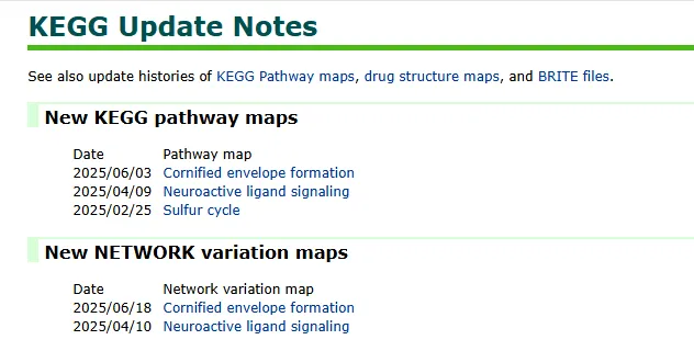 1. 数据更新:KEGG 每月新增约 80 个基因组数据,建议定期访问官网(https://www.kegg.jp/)查看更新日志。