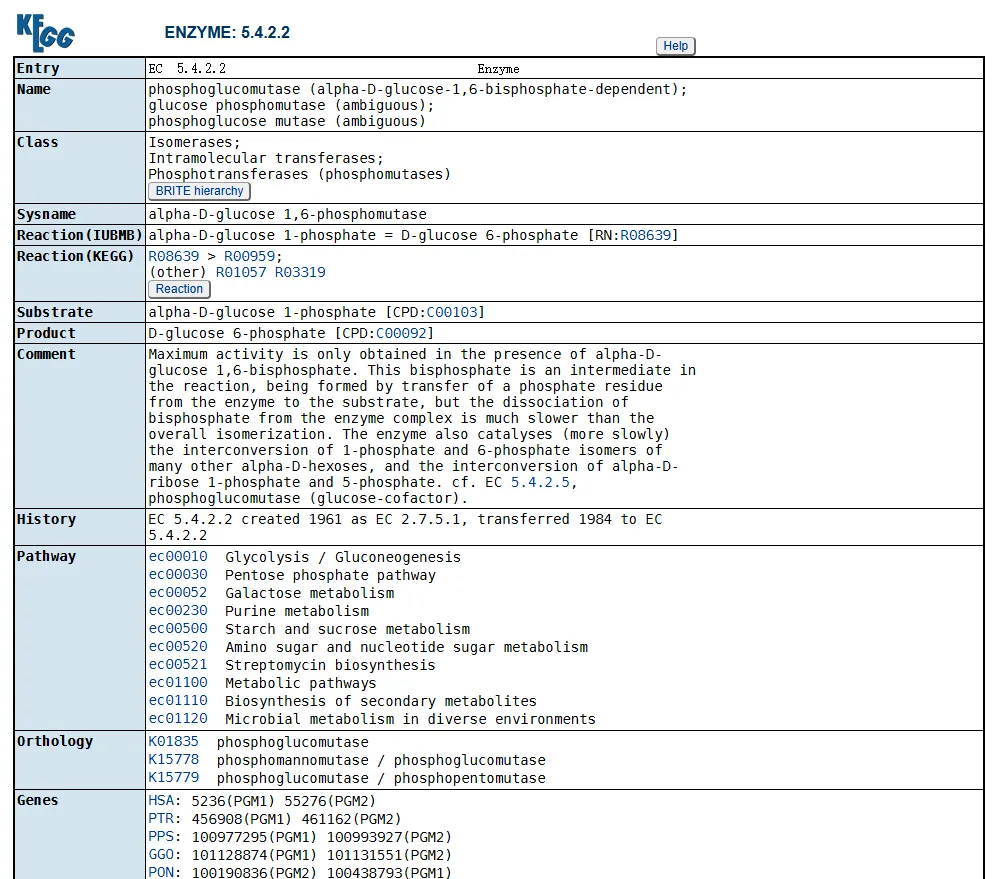 REACTION:存储酶促反应方程式,支持通过 EC 编号(如 5.4.2.2)或酶名称检索。