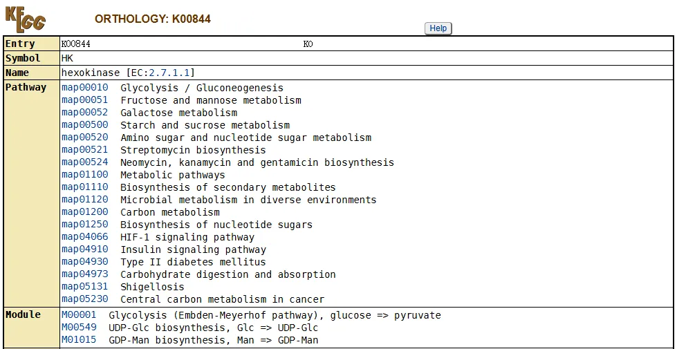 KO 系统:将不同物种中功能相似的基因归为同一 KO 组(如 K04257 嗅觉受体基因),支持跨物种功能比较。例如,人类己糖激酶基因 3101、3098、3099 均属于 K00844。