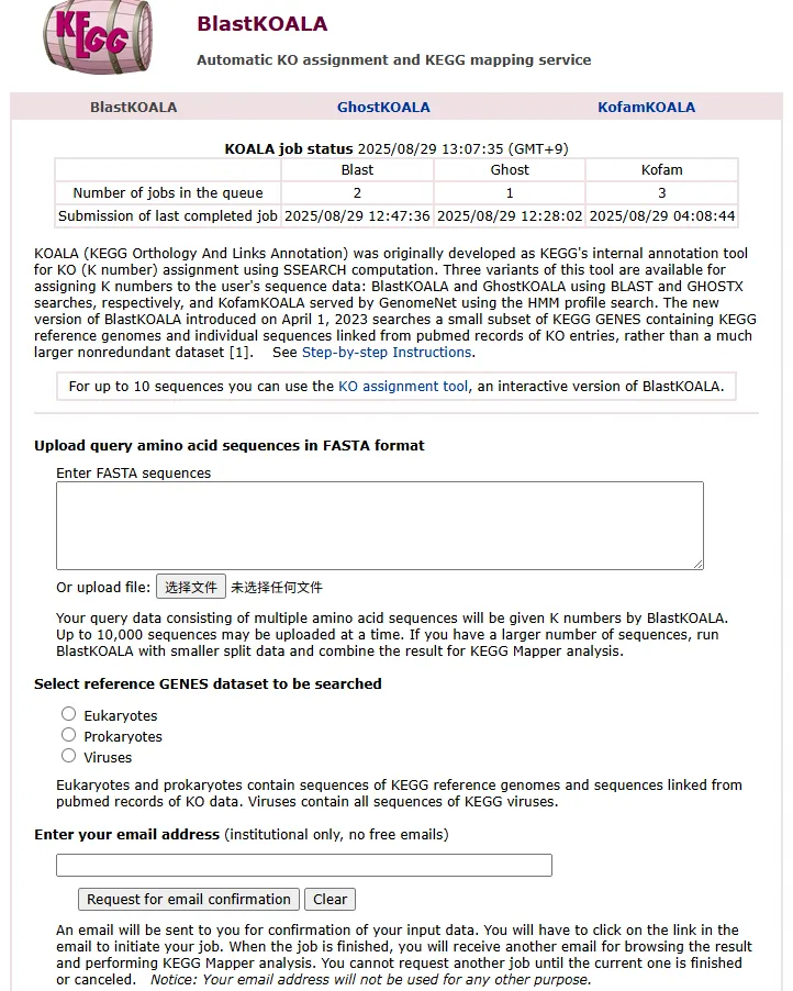 其中 GhostKOALA 速度更快,适合大规模基因组数据注释,而 BlastKOALA 精度更高,推荐用于中小型基因集分析。2025 年更新后,工具新增了病毒基因组的专属注释模块。
